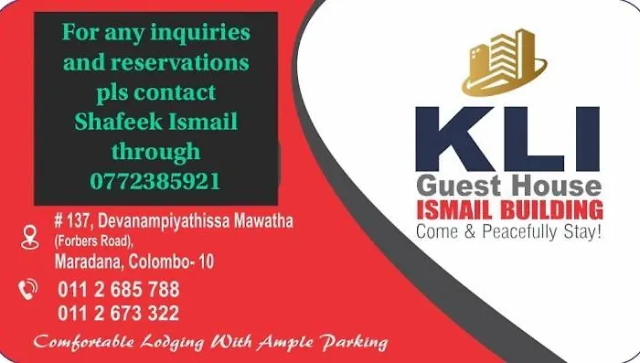 Kli Guest House & Lodge靠近Dawson Street Mosque,距离可倫坡市中心仅有5分钟路程. 您可以享受24小时保安服务 和货币交换.